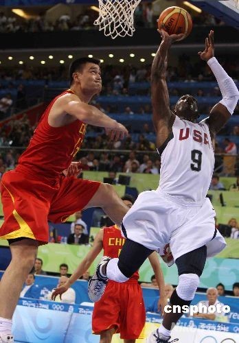 8月10日晚,北京奥运会(搜狐联想2008奥运、联想官网)男子篮球中国队与美国“梦八队”之战在五棵松篮球馆举行,中国队的超级中锋姚明防守NBA球星韦德得上篮。