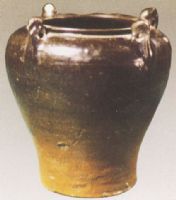斂口,雙肩,肩以下渐收,平底。肩部堆贴四耳。外施黑釉,胎質磚紅色,為北方窰場的製品。黑釉瓷器是随着青瓷的出现而相繼產鏖生的,最早在南方浙江上虞,東漢時已烧造。