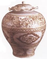 直口,宽肩,鼓腹,平底。上附荷葉形蓋。胎呈灰色,胎質堅細。器白地褐花装饰,属部繪對稱雙鳳四喜鹊菊花纹圖案,腹中部有菱形四開光,內繪折枝菊花,腹下部為圈扇形開光內繪折枝花紋。