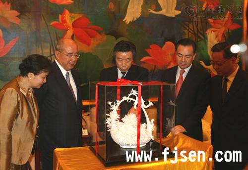 2008年8月14日晚,中共福建、省长黄小晶、省政协主席梁绮萍在厦门会见了来闽回乡祭祖的中国国民党主席吴伯雄及夫人一行。 双方互赠礼物, 本次礼品由福建省德化县大丰陶瓷研究所(东方玉)所长郑少华先生研制瓷雕精品--繁花似锦。 国台办主任王毅、国台办常务副主任郑立中,省领导何立峰、陈桦、刘德章、郑道溪,厦门市市长刘赐贵会见时在座。