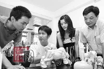 近年来,德化县利用台湾在高温能量陶瓷科技方面的优势,营造适应台资企业发展的产业环境。目前,已有8家台资陶瓷企业落户德化。图为台湾联宏科技德化办事处邱文新博士(左二)与德化陶瓷企业技术人员研究高温能量陶瓷。