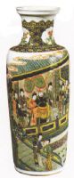 盤口,直頸,雙肩,简状腹,圈足。釉上五彩装饰,颈部锦地開光,内繪花卉等圖案,腹部為皇帝和皇后觀赏採莲圖。此器畫人物較多,刻畫栩栩如生,色彩加飾了黑彩和藍彩,使得書面更富表現力。