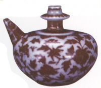 小口,短頸,扁圓腹,肩部置i短流,無柄腹部滿飾釉里紅纏枝牡丹紋。此器為軍特,為佛教僧侶俑器。此器造型別致,胎質細膩潔白,紋飾清晰,線條流暢,色澤艷麗,反應出釉里紅燒造水平。