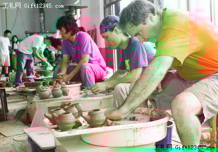 8月30日,在第四十三届国际陶艺学会大会淄博会场创作营暨2008国际木火节活动现场,来自阿根廷的陶艺家正在专心制作陶艺品。