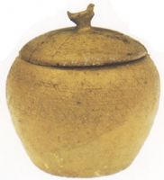 蓋罐為短直沿,斜圓肩,上部雙滿,平底。有蓋,蓋面圓鼓,蓋上鯉有一雙邢象簡練的小鳥,造型生動,稚拙可愛。肩部飾以水波紋,腹部飾編紋,通體施釉,釉色青黃發亮,薄而均凈,胎釉燒結緊密。