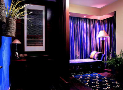 东南亚风情,舒张中有含蓄,妩媚中带神秘,兼具平和与激情。把家打造成浓艳绮丽的东南亚风情,它所带来的不仅是视觉的锦绣多彩,更是生活的曼妙体验。蓝紫色的窗帘、地毯与床铺打造出一个神秘异样的睡眠空间。虽然面积并不怎么大,但整个空间充满着无穷的魅惑感与迷幻感。