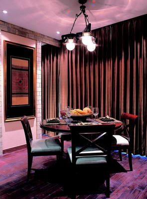 与客厅相邻的是个简单的小餐厅,简洁利索的家具设置与灯光营造令整个餐厅显得精致小巧,富有浓厚的生活情趣。与深樱桃木色相配合,设计师在此处的窗帘设计上采用了稳重却带有变化的浅棕色。虽然棕色会带有沉重的厚实感,但随着米色椅垫与晕黄灯光的渲染,整个色调显得清爽了许多,伴随着棕色窗帘的诸多色泽变化,整个餐厅充满神秘气息,富有浓郁的浪漫情调。
