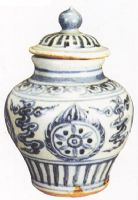 青花蓝中泛灰,為國產“平等青”所致。繪書簡潔淡雅為成化風格,在罐類中少見。出土時有明成化三年(1467年)紀年。此罐以法輪為主题,應屬佛教用盛聍器。
