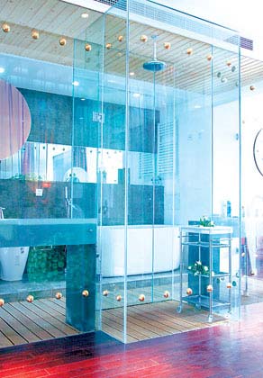 在有着两个卫生间的大房子里,一些前卫的人,会将主卫与卧室打通,形成开敞式的大空间。因为主卧是主人独自活动的区域,私密性非常强,于是将卧室与卫浴间之间的墙拆掉,装上大面积的玻璃、玻璃砖,或采用镜面,营造出通体透明的卫浴空间,这样既达到了视觉通透,又做到了干湿分区。浴室时髦、美丽、舒适,又非常实用,透明浴室不但注重了沐浴功能性,也特别凸显出生活享受与品位。