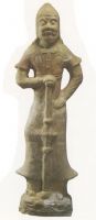 泥質灰陶。俑採立姿。頭戴圆顶兜鍪,護耳下垂至颈部,面龐方圆,雙目圆睁,雙唇紧閉,捲曲络腮鬍。肩披燕尾状披膊,身穿鎧甲,圆形護胸,内套窄袖衣。左手叉於腰際,右臂曲置胸前,手扶握一仗饰。胸、腰部各繫一帶,右腿略彎曲,足蹬圓頭靴,踏於方形台座之上。鎧衣上施红彩,衣襬部墨繪方格紋。