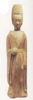 泥質灰陶。俑採立姿。頭戴黑色籠冠,面龐圆润豐滿,長眉细目,鼻梁高挺。身穿交领右衽廣袖衫,下着長裙,腰繫带。右臂彎曲置於腰部,手作持物状;左手籠於袖中,自然下垂。