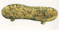 盤呈長條形,中间束腰,兩端為圆弧形。盤口微斂,浅腹,平底,下設四個馬蹄足。盤身以淺黃色釉為地,上以綠、赭兩色繪同心圓狀花紋