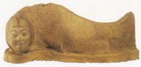 紅陶。人面魚身,面長圆,高鼻鼓睛,口凃朱。髮絲細密形成魚腮,魚身横卧於台座上,體彎曲呈游動状,尾向後襬。有背鰭和腹鰭,背鰭略殘,通身刻饰细密的鱗紋。腮、鰭、尾均凃有黑彩。