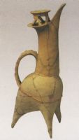 夾砂白陶。雙層圆口,上小下大,兩口皆抽平沿。上下口之間以五根细陶柱斜撑。下口置一鳥喙形流,向上斜伸,長直颈,鼓腹,下設三袋足。颈腹間設一带形鋬,鋬兩側飾以波浪紋。腹中有一圈堆塑的窄带,用以装饰