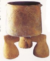 夾砂褐陶,手制。盂為椭圆形直口、微侈、筒形腹,腹壁微外强,大平底。口沿下有四道弧形附加條紋,兩侧各有一乳釘,底部有編織紋。支脚呈倒靴状,頂面如窄楔,下中空。