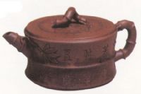 器呈竹節状,圆口,平肩,平盖,流、鋬及盖鈕均為竹饰状。腹部陰刻“單吳生作羊豆用享",下署楷書“曼生’’款,盖内鈐陽文篆書“萬泉”。
