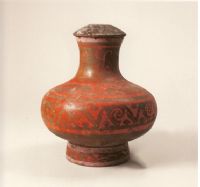 锺为敞口,细长颈,鼓腹,圈足。有碟式小盖。自颈至足,以白、红色彩绘出圆点、几何、抽象人物等图案。锺即圆形壶,用以盛装酒浆或糧食,盛行於汉代。陶锺是仿照铜锺制作的明器。