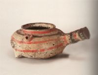 直口,平唇,矮颈,扁腹,三乳状足。肩部置兽首流,腹部装管状柄。灰色胎,手制。器通体塗白粉,彩绘红、黑两色的粗弦纹。该壶造型简朴,为生活中的实用器。