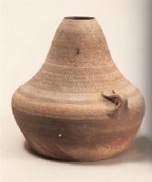 小敛口,斜肩,弧折腹,平底。颈、肩等处饰有水波纹、弦纹和锥点纹,肩部附牛形耳。匏壶是广州地区汉代南越人的典型器物,在浙江尚属首次发现。