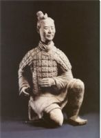 武士呈单跪射箭状,头顶一侧挽高髻,髻根用朱红带束扎,似风吹动,眉目清秀,平视前方,目光炯炯有神,神态庄严。