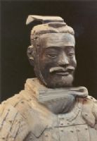 军吏俑为灰陶,泥质细腻。该俑昂头前视,是英勇善战的将士。秦代的匠师们以写实手法,真实生动地刻画军吏形象