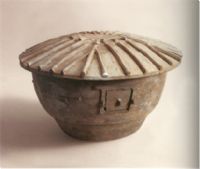 泥质灰陶。囷身较矮,有一方形门。囷顶为斜坡形,上堆贴瓦楞,形制简朴。该器为随葬品。