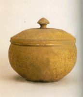 钵敛口,圆唇,鼓腹,平底,带盖,盖为弧形,中央置一蘑菇钮。通体施釉,釉色黄中泛绿,胎釉结合不好,已开始脱落。在这件青瓷带盖钵上,西晋繁复的装饰已逐渐消失;从造型和胎釉诸方面来看,与长江下游东晋出土的同类器物相接近,可能是长江下游的产品。