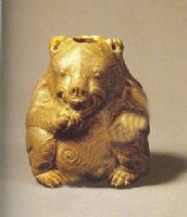 青瓷熊尊为灰色胎,青黄色釉,釉色允润。模制成型。造型作一熊踞坐吃食状。一爪捧物置口前,一爪放腹上,矫健中而露憨态,逗人喜爱。通体饰茸毛状纹和卷曲纹。顶部有一圆孔,可能以插烛或作酒器或作水滴用。为六朝青瓷精品。