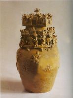 顶部为一建筑群,中间系一悬山顶建筑,四角各立一望楼。中部堆塑形态各异的人物。下部呈罐形,其上附贴牛羊等动物。