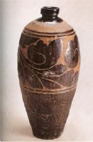 小口,圆肩深腹,下腹平缓敛收,底内凹呈圈足。红褐色胎,遍施酱色釉。瓶肩部、腹部剔釉装饰,肩部为宽带纹,腹部做卷叶图案,通体釉色光亮,剔刻技术娴熟,线条粗犷,造型圆浑。
