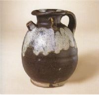 之间,另两面各有一系,壶裹外均施釉,外部施釉不及底,釉呈黑褐色,口上有色斑纹三个,腹部两面有不规则琉璃点,斑点均为灰度蓝色。