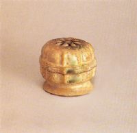 圆形,盒蓋与盒底子母口扣合,蓋项模印八角形凸花,蓋壁弧状,上下口边为多边菱形,束胫,喇叭形圈足稍外撇。足底模印行书(张)字陽文。