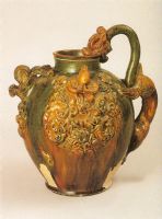 短颈,长圆形腹,平底。肩腹间饰龙首形流和龙形把手。流下印贴一獸头,两侧肩腹间贴塑人物及花卉纹。通体施黄绿色釉,釉色鲜丽,流淌熔融,尤其是作品的贴塑工艺之精湛,构思之奇巧,反映了唐代制陶工艺的发达,此类作品,传世较稀少,是唐代彩色釉陶器中出类拔萃之作。