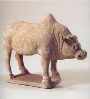 牛直立于方形踏板上,作平视前行状。双角,大耳直立,眼圆睁,鼻孔大张,肩胛高隆,躯體浑圆健壮,神态温顺笨拙。