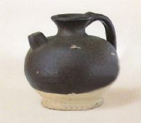 小壶撇口短颈,圆腹,短流,平底,一龙首柄连于口沿与壶腹之间。上半部施黑釉,釉色黑高,开有细小纹片。其施釉方法應屬蕩釉工藝,胎釉界线分明,无流淌现象。此器具有唐代典型风格,随着时代的推移,此类小壶的流下不断加长,而壶身也由扁圆而变得细长。