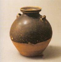 盘口、短颈、溜肩,肩下部饰对称双击系,鼓腹下收,平底。胎质略呈鐵红色,留有轮制痕迹,施半釉,釉色不太均匀。婺州窑历史悠久,早在四千多年前就烧制陶器,此盘口壶为唐代婺州窑产品。