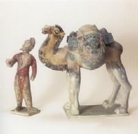 驼通体彩绘,伸颈扬头,驼背上铺有椭圆形花边毯子,驼架上横置纹饰华丽的丝绸袋囊,两侧掛着扁壶、山雉、野兔、刀鞘、箭囊等物,一变機靈、调皮的小猴爬在驮袋上,似在玩耍。俑深目虬髯,身着鲜艳的翻领胡服,侧身站立,昂首挺胸,手作牵拉状。这一组人物生动地反映了当年丝绸之路上的运输情景。