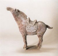 陶马胎底青灰度,上绘赭红色。四腿直立于长方形踏板上,鞍韉俱全。陶马伸颈昂首,马鬃莲然耸起,似在作嘶鸣抖擞,缠系着的马尾屈翹,呈摇摆状。艺术造型逼真生动,姿态极为雄健。
