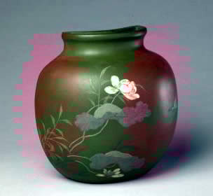 壁瓶半圆式,正面敞口鼓腹,背部平坦,颈后下方有方形小孔,便于悬挂。紫红色砂泥,细腻光润。腹部彩绘莲塘花鸟图,池塘中水波荡漾,荷花盛开,几枝芦苇随风摇曳,一只水禽展翅从远方飞来……彩绘色调柔和,用色淡雅清疏,犹如一幅工笔绢画,令人回味无穷。