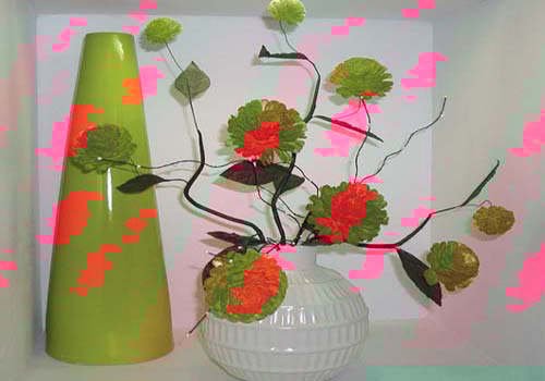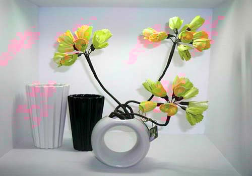 黄白,高矮的花瓶透露着和谐,婀娜的枝干开出朵朵芬芳,橙色的花瓣把纯白的空间渲染得空旷而赋予感染。