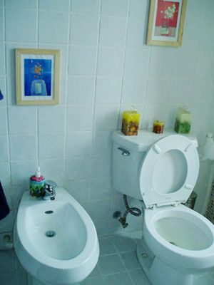 抽水马桶的冲水槽上方是用厕时达不到的地方,我们可以利用此空间做一吊柜,深度约15厘米,才不致给人造成不便。柜内可放置卫生纸、手巾、洗洁剂、女性卫生用品等,也可在下部做成开放式,放些绿色植物装饰。