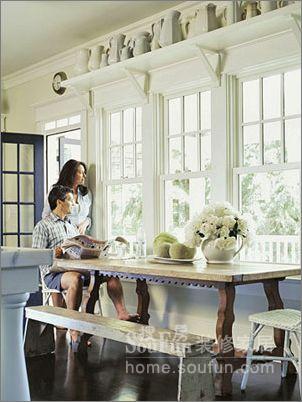 一张简单的长条木餐桌搭配仿旧的木椅,自然的味道油然而生,仿佛与室外的蓝天绿树融为一体。餐桌上方陈列的一排主人收藏的瓷罐闪着奶白色的亮光,与周围的环境相协调。