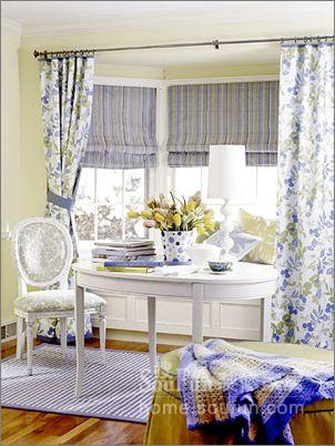 本图中的休闲餐厅布置得非常优雅清爽。尽管空间很小,但蓝色系的各种织物将白色的餐桌椅烘托得情调十足,空间也显得大了很多。