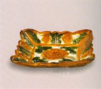 模制成型,器呈方形,曲边,敞口,斜直壁,浅腹,平底。内底有三个等距排列的支钉痕。