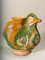 造型为浮水鸳鸯,背上有喇叭状五瓣花形壶口,后部连接尾羽为一水波纹柄,鸳鸯头部昂起,两眼凝视前方,嘴部中空为流,腹下素面无釉,平底假圈足,全身釉色混凝,但整体黄、绿、白三彩鲜艳绚丽,翅膀羽毛範模压印而成,犹如浮雕,极富立体感。