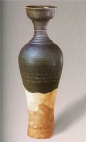瓶洗口,细颈,溜肩,肩以下渐收,足部微外撇,圈足。胎体坚实粗糙,颈、肩部饰弦纹数道,腹部留有数道拉坯弦纹。