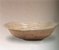 敞口,沿外侈,弧壁,浅腹,圈足。黄白瓷胎,上白色化妆土,施牙白色透明釉,釉面有开片,外施釉不至底,内壁雕三组双叶牡丹花,盘心有四个渣垫痕。