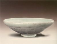 敞口,浅腹,壁斜收成小平底,外壁刻莲瓣纹,碗内素面,胎较之背诵略显厚,青白釉晶莹润泽,有一定程度的透明性。