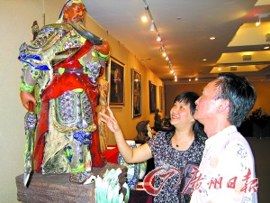 佛山陶瓷工艺大师杨锐华创作的艺术陶瓷作品《忠义天神》近日在广东传统工艺美术精品大展上获得金奖。该作品运用中国传统衣纹表现手法,结合西欧城雕表现方法,取用简练线条,高度概括衣纹、精雕细刻甲纹服饰,产生一种对比强烈的效果。再加上釉上配搭“蓝绿均釉”与“华红釉”对比度强而又统一协调有变化。图为《忠义天神》在展出。(记者 黄建华 摄)