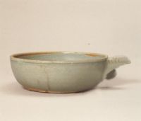 该瓷匜口微敛,平唇,浅腹,平底。其造型类似钵,但在口沿一侧安有一槽状流,流下附卷云形小鼻。通体施青白釉。口沿及外底部露胎,胎质细腻,在釉与露胎衔接处有火石红痕。